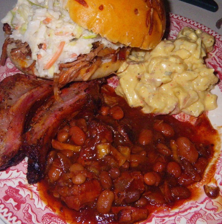 Or make yourself the best sandwich and plate of BBQ you can imagine...  Add your own Cole Slaw, serve on a home made hamburger bun, with a couple bones of Baby back ribs, and sides of Smoked beans and blue cheese potato salad!