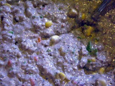 - Put the blue and yellow corn meal in separate bowls. Add half the flour, baking powder and baking soda in with the corn meal. Sprinkle a bit of salt in each. Mix each corn meal mixture with the separate onion mix.